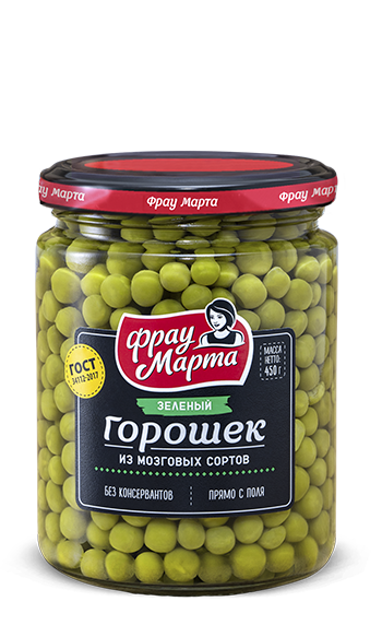 Зеленый горошек «Фрау Марта» приготовлен согласно требованиям ГОСТ, что гарантирует высокое качество продукта и сохранность витаминов и микроэлементов, а прозрачная упаковка из стекла позволит убедиться в этом не вскрывая банки.