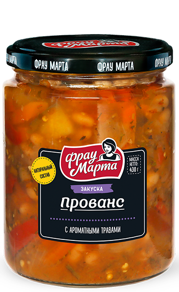 Закуска «Прованс» от бренда «Фрау Марта» с ароматными травами – идеальный гарнир на обед или ужин, да и любой приём пищи. Вкус, который перенесет Вас в самобытные французские деревушки. Прованские травы — это популярная французская приправа, в которой ингредиенты великолепно сочетаются между собой, дополняют и раскрывают вкусовые и ароматические свойства белой фасоли, баклажанов и южного сладкого перца.